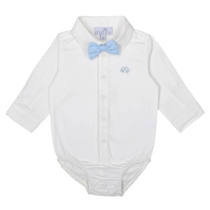 Een wit katoenen bodyhemdje met licht blauw strikje. Het strikje kan eraf gehaald worden, zodoende kan het hemdje na het feest ook doorgedragen worden.