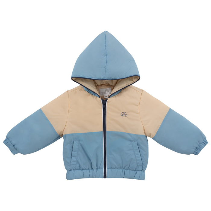 Lichtblauw met beige gewatteerde regenjas met een kap en ritssluiting. De jas heeft vooraan twee steekzakken. Deze jas is perfect om te dragen als het 's morgens en 's avonds nog frisser is tijdens het voor- en najaar. Deze jas kan perfect gewassen worden in de wasmachine.
