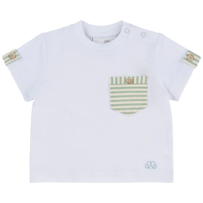 Witte katoenen T-shirt met gestreept groen/wit zakje afgewerkt met een beige knoop. De mouw is afgewerkt met dezelfde gestreepte groen/witte stof en een beige knoop. Tot en met 2 jaar is deze T-shirt voorzien van drukknopen aan de schouder zodat het makkelijk is om aan te doen. Heel leuk om te combineren met de short in dezelfde groen/witte stof.